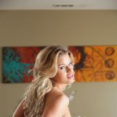 Jessa Rhodes is alone. She is wearing a green top and jeans shorts, she is on the white leather sofa. She takes off the top and shows her boobs. Her nipples are hard. She takes off panties and shows her pussy. We can see her clitoris. She shows her body from different angles.