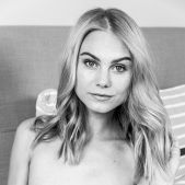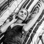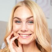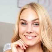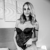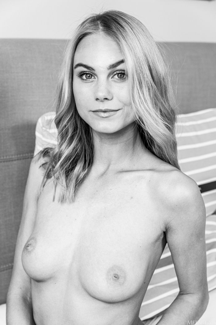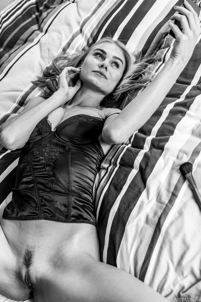 Sexy blonde Nancy A does her makeup, ready for a hot date. She's not dressed yet, lounging on her bed in elegant lingerie, her neat bush visible through the sheer panties. With time to spare, the blue-eyed stunner runs her hands over her gorgeous ass as she slips her panties off, thighs parted to expose the plump lips and luscious contours of her sweet pink pussy. She smiles to herself as she fondles her beautiful breasts, wondering what fresh fun her date will offer.